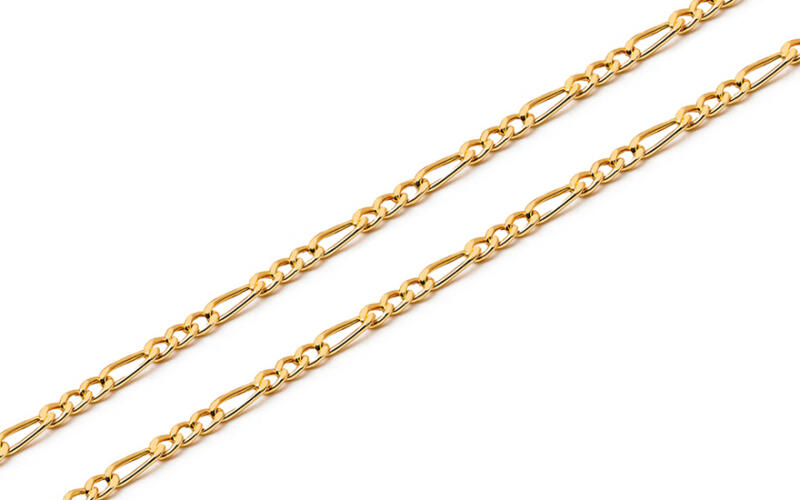 Finom Figaro lánc, amely ovális láncszemekből áll, rendszeresen váltakozva három kerek alakú láncszemmel. A használt rögzítés rugós karika. A lánc medál nélküli viselésre alkalmas, de egy szép medállal is kombinálható. Az arany felülete fényes.