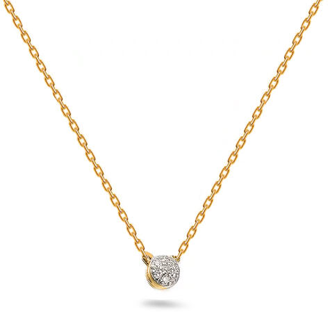 Arany minimalista nyaklánc sárga aranyból. A finom láncot kerek medál készlet díszíti briliánsokkal, összesen 0,020 ct H színnel és SI1 tisztasággal. A gyémántok iZlato® eredetiségi tanúsítvánnyal rendelkeznek