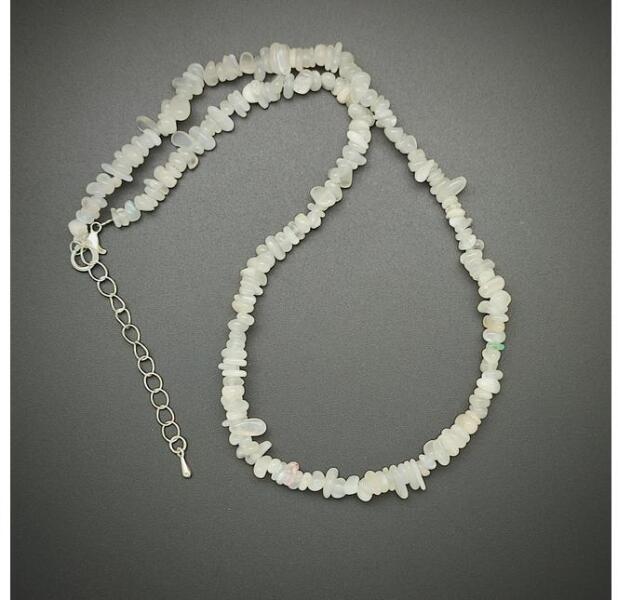 Holdkő fehér splitter lánc – 40 cm kapcsos Leírás A fehér holdkő splitter lánc egy különleges ékszer, amely a női energiák és a harmónia szimbóluma. A természetes ásvány apró szemcséi finoman simulnak egymás mellé, megőrizve a holdkő egyedi fényjátékát. Kapcsos kialakításának köszönhetően könnyen viselhető és méretre igazítható, így mindenki számára ideális választás lehet. Jellemzők