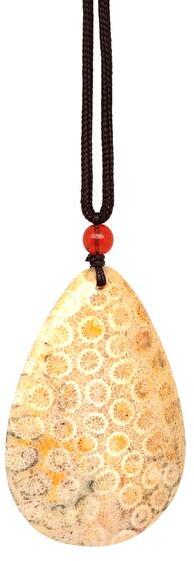 Korall fosszília csepp medál – A minőség, 5–6 cm | Zsinóron, piros gyönggyelA korall fosszília medál a természet időtlen szépségét viseli magán: a megkövült koralltelepek apró, „virágos sejtmintázata kirajzolódik a simára csiszolt, csepp formán . A 5–6 cm-es méret elegáns, mégis határozott jelenlétet ad – igazi, jól látható fókuszpont. A meleg bézs–homok–méz árnyalatok sok ruhatónussal harmonizálnak, a fekete zsinór és a piros díszgyöngy pedig letisztult, azonnal hordható megoldást kínál. Miért különleges?